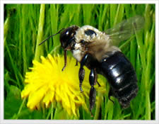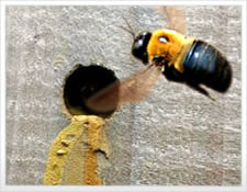 Carpenter bees are large with black and yellow markings. They are most active in the spring time, and can be mistaken for bumble bees – the most marked difference is their black, shiny tail. Male carpenter bees have no stinger and are usually found hovering around their nests to protect against predators and competitors. They are non-aggressive (except to other male carpenter bees). Female carpenter bees do have the ability to sting if threatened. Their nesting holes are generally around a half inch in diameter.